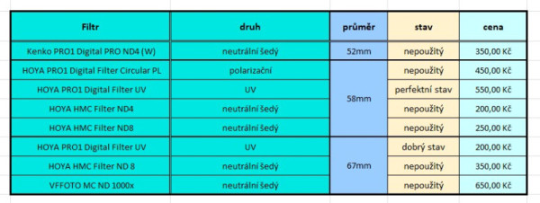 Prodám filtry o průměru 67 mm, 58 mm a 52 mm, specifikace a ceny viz obrázek.